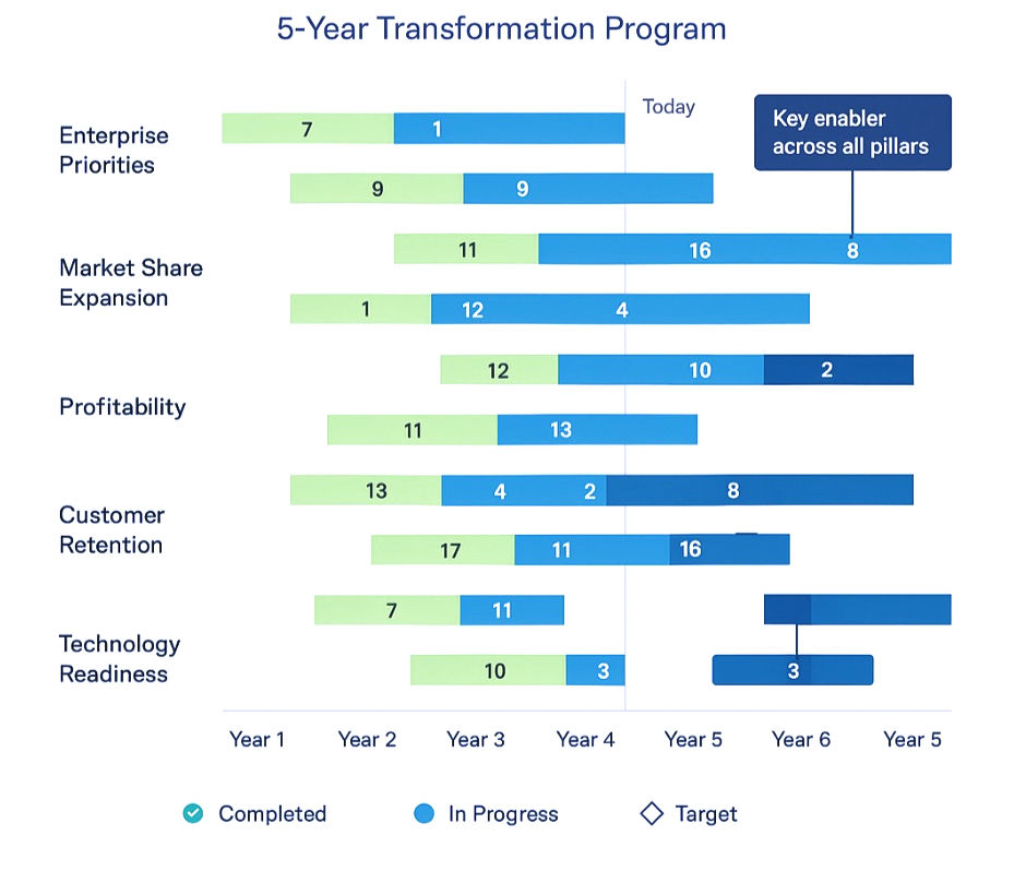 Tackling tariff uncertainty requires a structured approach. This project-style roadmap illustrates how companies can sequence actions – from assessing immediate buffers to longer-term restructuring. For example, steps may include inventory and supplier reviews now, followed by diversification initiatives and capital reallocation in upcoming quarters. Such visual frameworks help CEOs track tariff-related initiatives across functions and timelines.